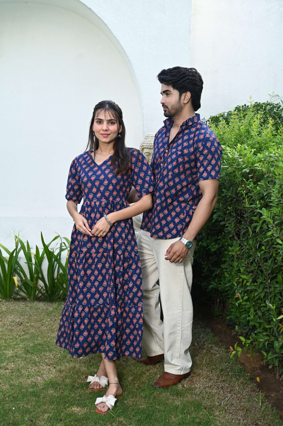 This navy blue matching outfit set includes a women?s midi dress and a men?s short-sleeve shirt, both featuring vibrant red ethnic prints. Perfect for couples who love twinning in style at casual outings, festive gatherings, or vacations.